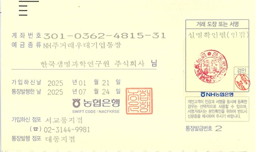 온라인 입금계좌: 농협 301-0362-4815-31(예금주 : 한국생명과학연구원(주))